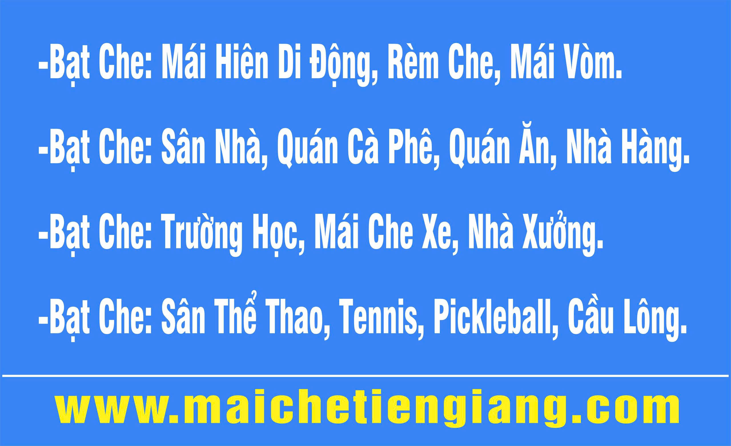 Giải pháp Mái Che Di Động mang lại sự tiện ích che mưa nắng ngoài trời cho: Mái Che Sân Nhà, Mái Che Quán Cà Phê, Mái Che Quán Ăn, Mái Che Quán Nhậu, Mái Che Nhà Hàng, Mái Che Trường Học, Mái Che Nhà Xe, Mái Che Khu Resort, Mái Che Nhà Biệt Thự, Mái Che Nhà Phố, Mái Che Nhà Chung Cư, Mái Che Sân Thượng, Mái Che Cơ Quan, Mái Che Hồ Bơi, Mái Che Nhà Kho Xưởng, Mái Che Bến Xe, Mái Sân Thể Thao, Tennis, Pickleball, Cầu Lông, Mái Che Nhà Ga.